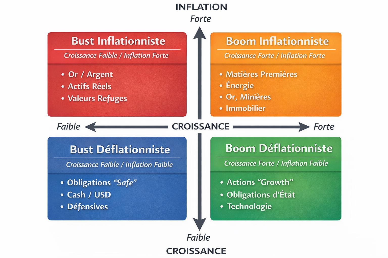 Ce cadre a un intérêt concret : il vous dit quel type d’actifs respire le mieux selon le régime, et il vous permet de comprendre pourquoi certaines classes d’actifs décollent ou se cassent la figure.