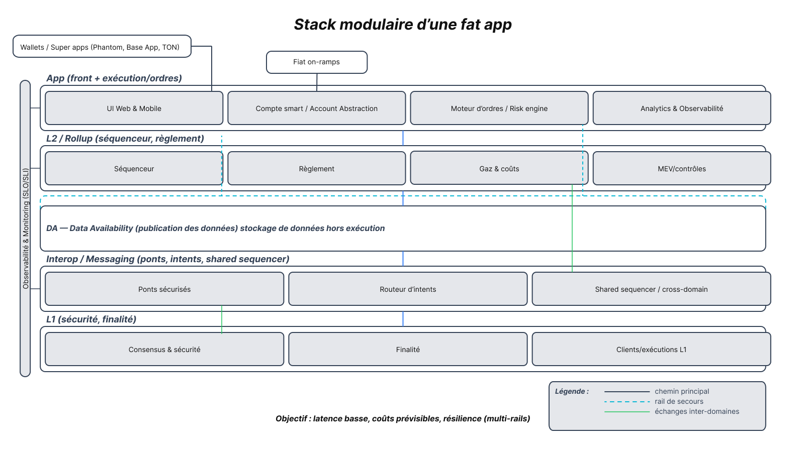 Définition. Une fat app internalise des briques critiques (exécution, carnet d’ordres, règlement, identité, data, parfois sa propre L2/appchain) pour capper la valeur au niveau de l’application (fees, order-flow, data, royalties).