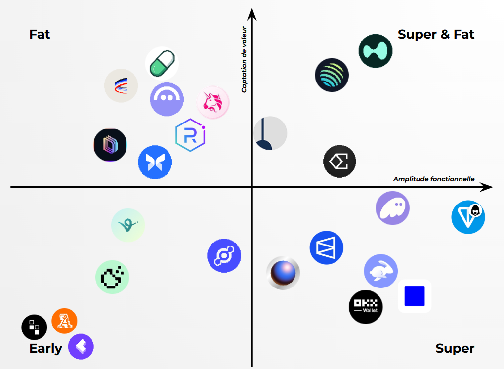 - Haut-droit (Super & Fat) : large périmètre et forte capture → meilleur profil de re-rating.